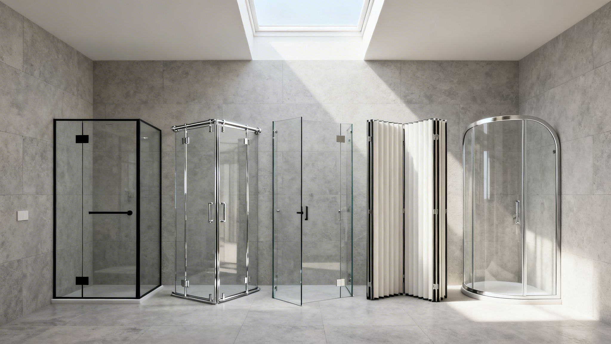 Diferentes tipos de mamparas de ducha: una de cristal transparente y otra con biombo plegable en un baño moderno con azulejos.